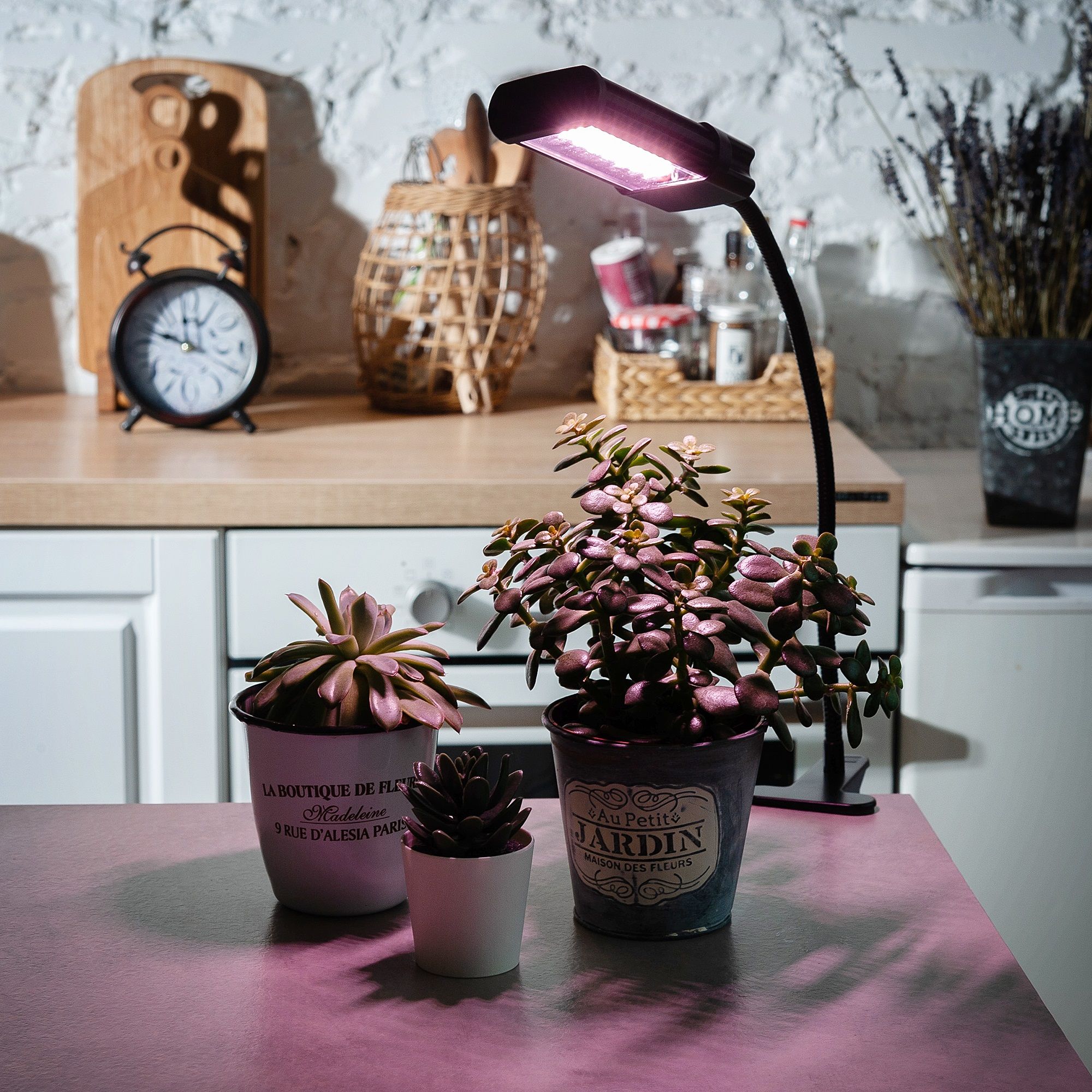 Светильник для растений светодиодный на прищепке ULT-P31-12W/SPLE/40 IP40 BLACK SINGLE от Uniel предназначен для освещения и досветки в помещениях декоративных растений, ароматных трав и рассады. Мягкое розовое свечение спектра SPLE повторяет спектр требующийся растениям для фотосинтеза. Фитосветильник прост в установке. Гибкая ножка позволяют напралять свет плафона в пределах 360°. С помощью удобной прищепки светильник легко закрепить на любой поверхности. На корпусе имеется выключатель. Высота светильника 620 мм, длина гибкой ножки - 400 мм, вес 522 г. Источником света являются светодиоды, которые не нагревают воздух при работе и экономят электроэнергию. Класс энергопотребления А+. Срок службы светильника светодиодного - 30 000 часов. Длинный шнур питания - 1,2 метра. Гарантия на светильник составляет 2 года.