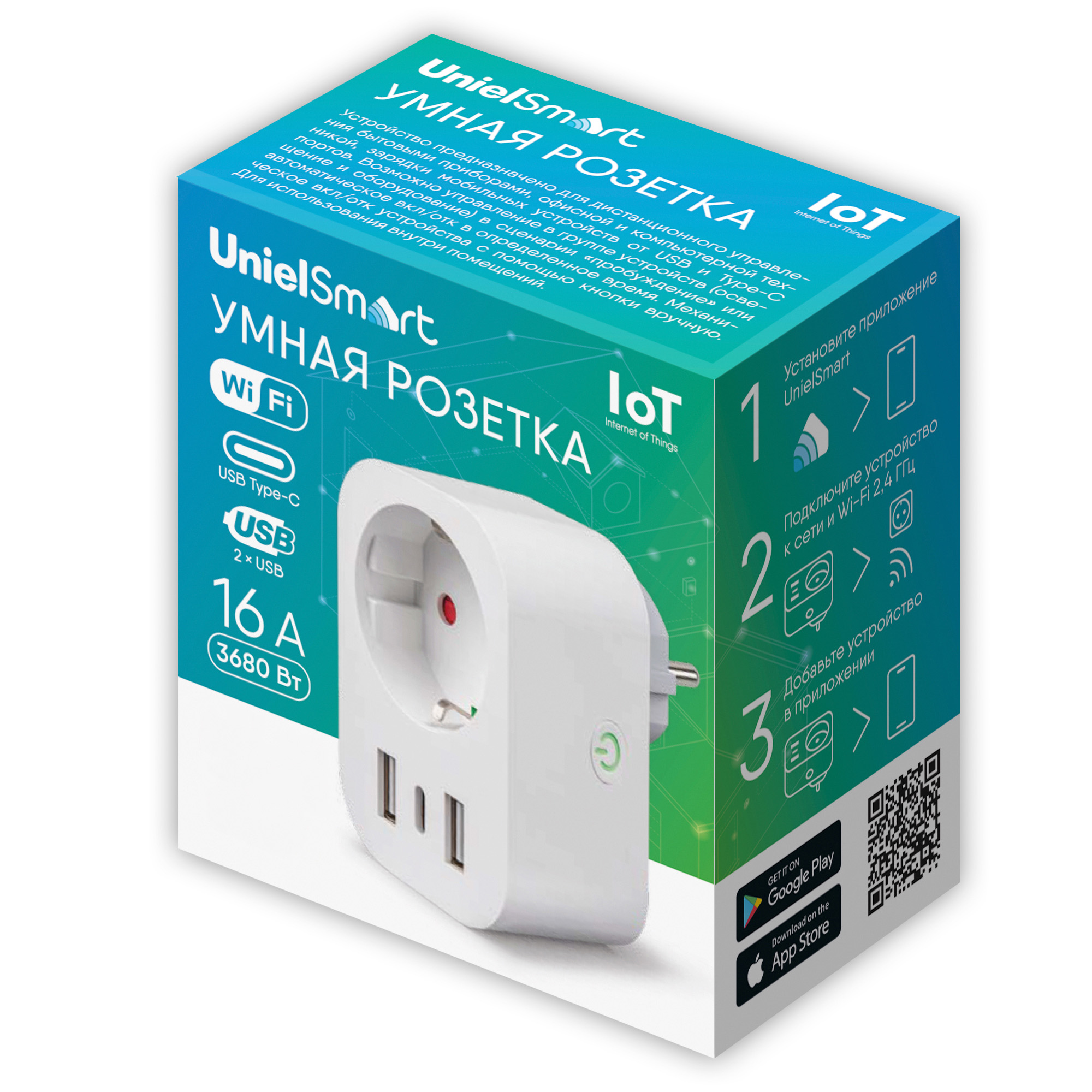Умная розетка USH-A103 1G-UC-WF WHITE со встроенным модулем Wi-Fi предназначена для дистанционного управления бытовыми приборами, светильниками, офисной и компьютерной техникой, зарядкой мобильных устройств от USB и Type-C портов через приложение UNIEL Smart. Управление возможно как отдельно розеткой, так и группой USB портов (до 30 возможных манипуляций в сутки) или всем устройством в целом. Доступно управление в группе устройств (освещение и оборудование) в сценарии «пробуждение» или автоматическое включение/выключение в определенное время суток (до 30 возможных манипуляций в сутки). Возможно механическое включение/выключение умной розетки Uniel с помощью кнопки вручную. Наличие функции анализа электропотребления, подключенных к устройству приборов. Защита от доступа детей. Доступно голосовое управление. Для использования внутри жилых помещений.