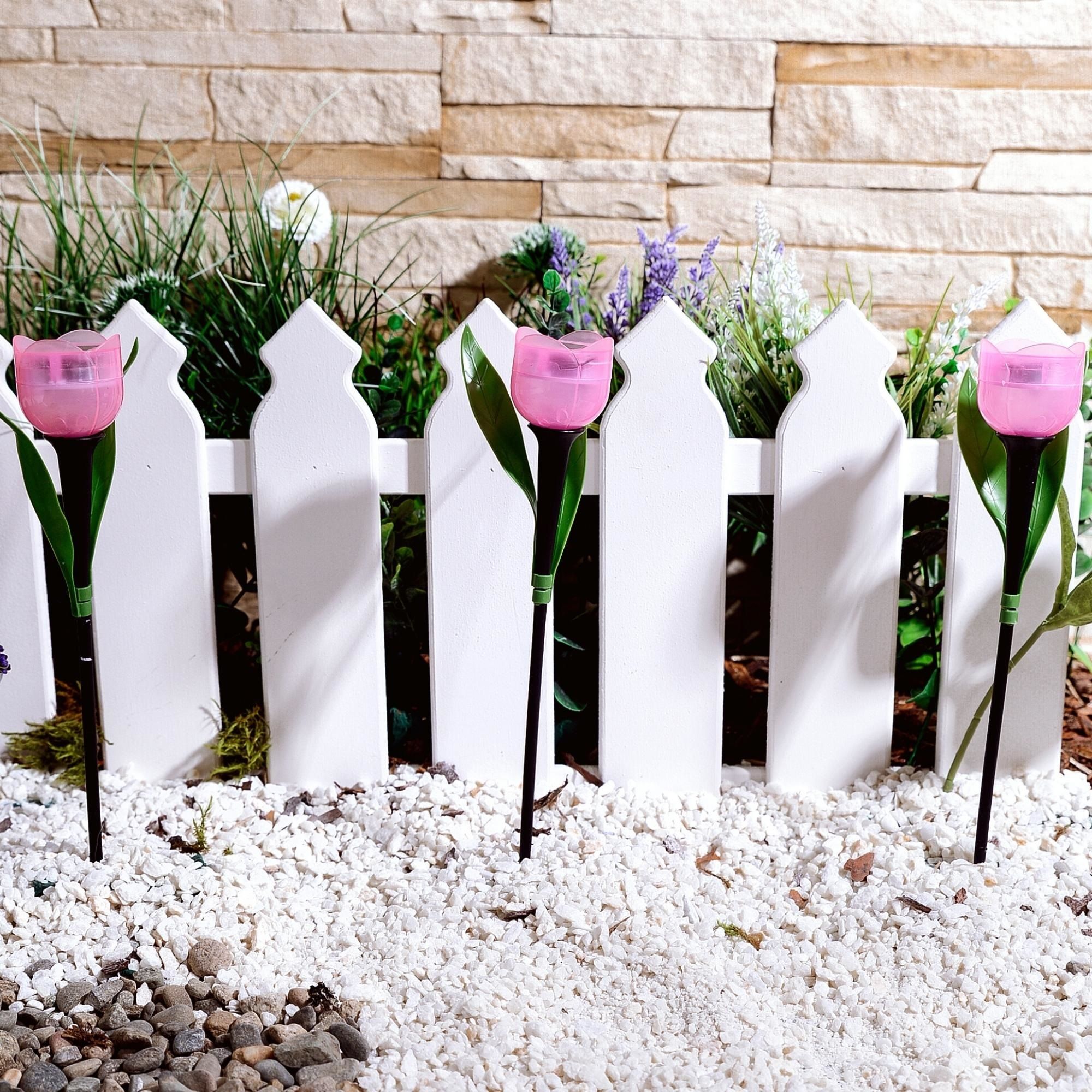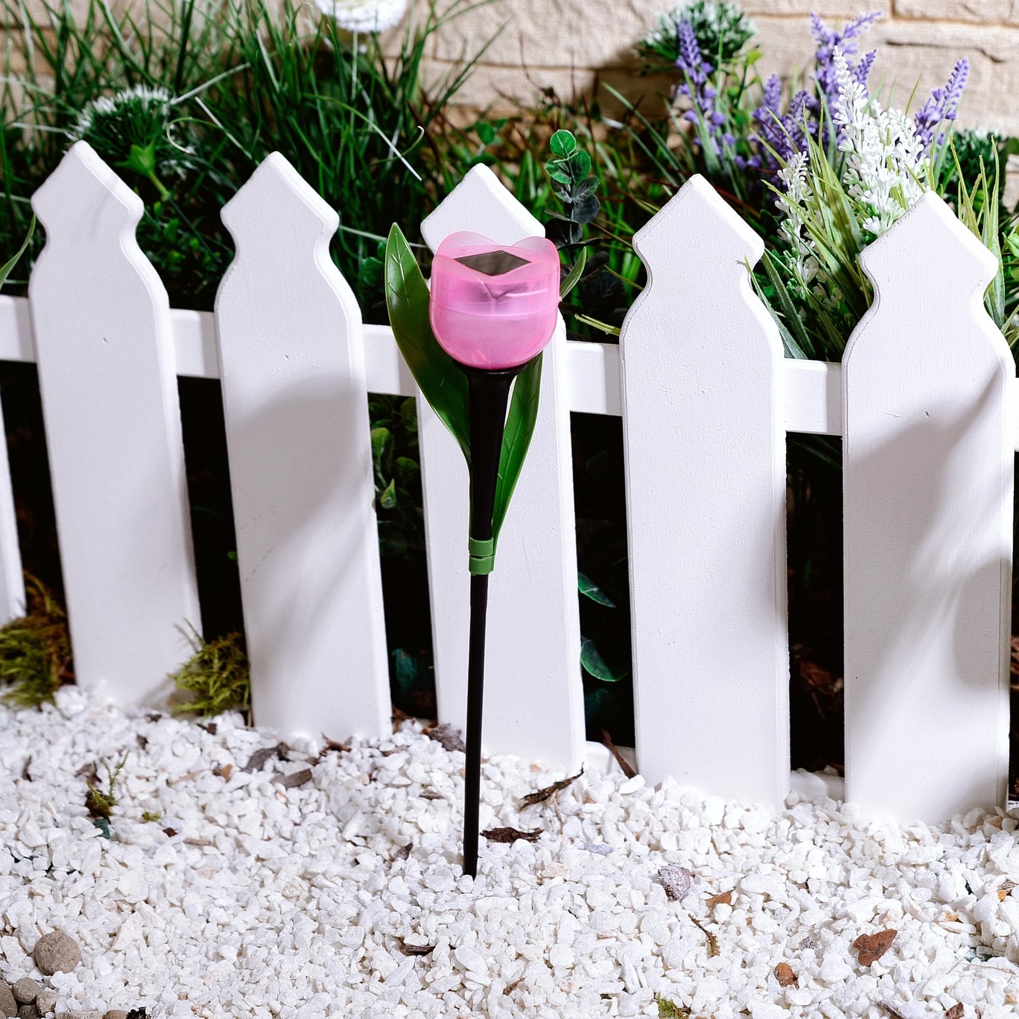Cадовый светильник на солнечной батарее USL-C-451/PT305 PINK TULIP предназначен для декоративной подсветки сада - для газонов, клумб, альпийских горок. Прибор устанавливается вертикально в землю с помощью пики. В светильнике используется один светодиод с белым цветом свечения. Светильник предназначен для уличной подсветки, диапазон рабочих температур светильника от -20 до +35 °С. Корпус светильника изготовлен из пластика розового цвета, степень пылевлагозащиты IP44. Удобный выключатель расположен под крышкой плафона. Подключение к электросети не требуется. Встроенный аккумулятор 40 мАч, заряжается в светлое время суток с помощью солнечной панели. Полностью заряженный аккумулятор обеспечивает свечение до 8 часов. Габариты устройства - ДхШхВ 50х50х305 мм. Общий вес комплекта 46 г. Гарантия - полгода. Срок службы светильника - 30 000 часов.