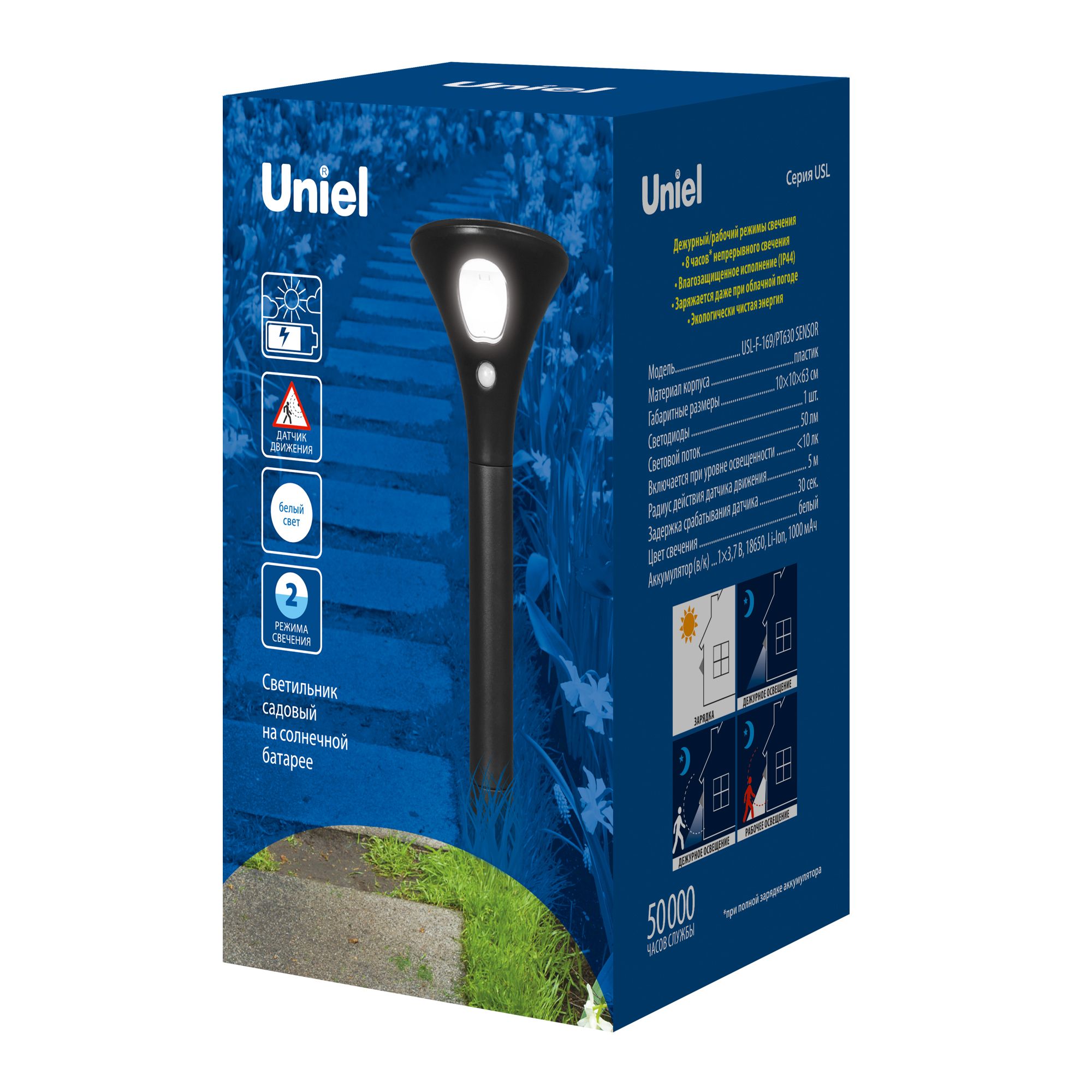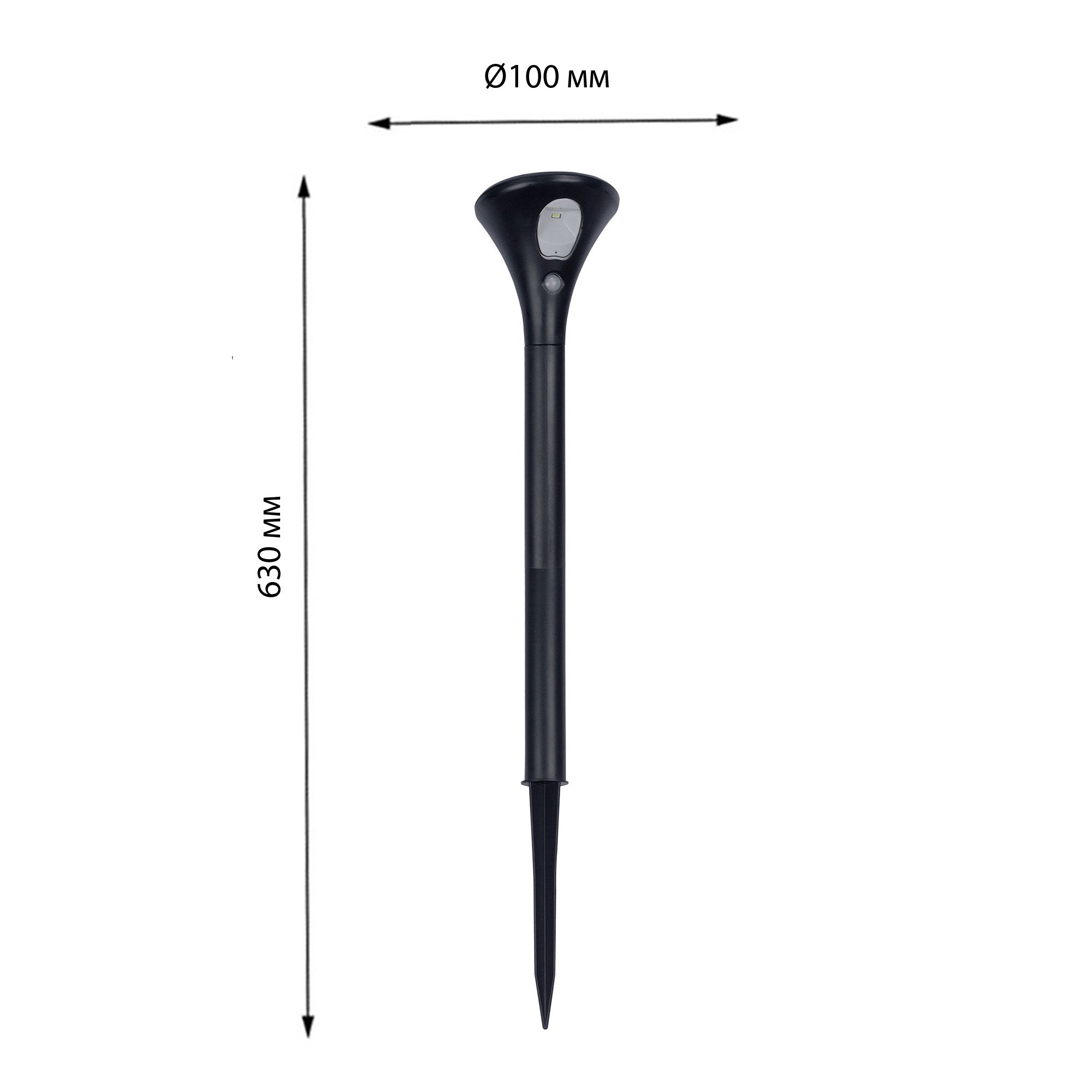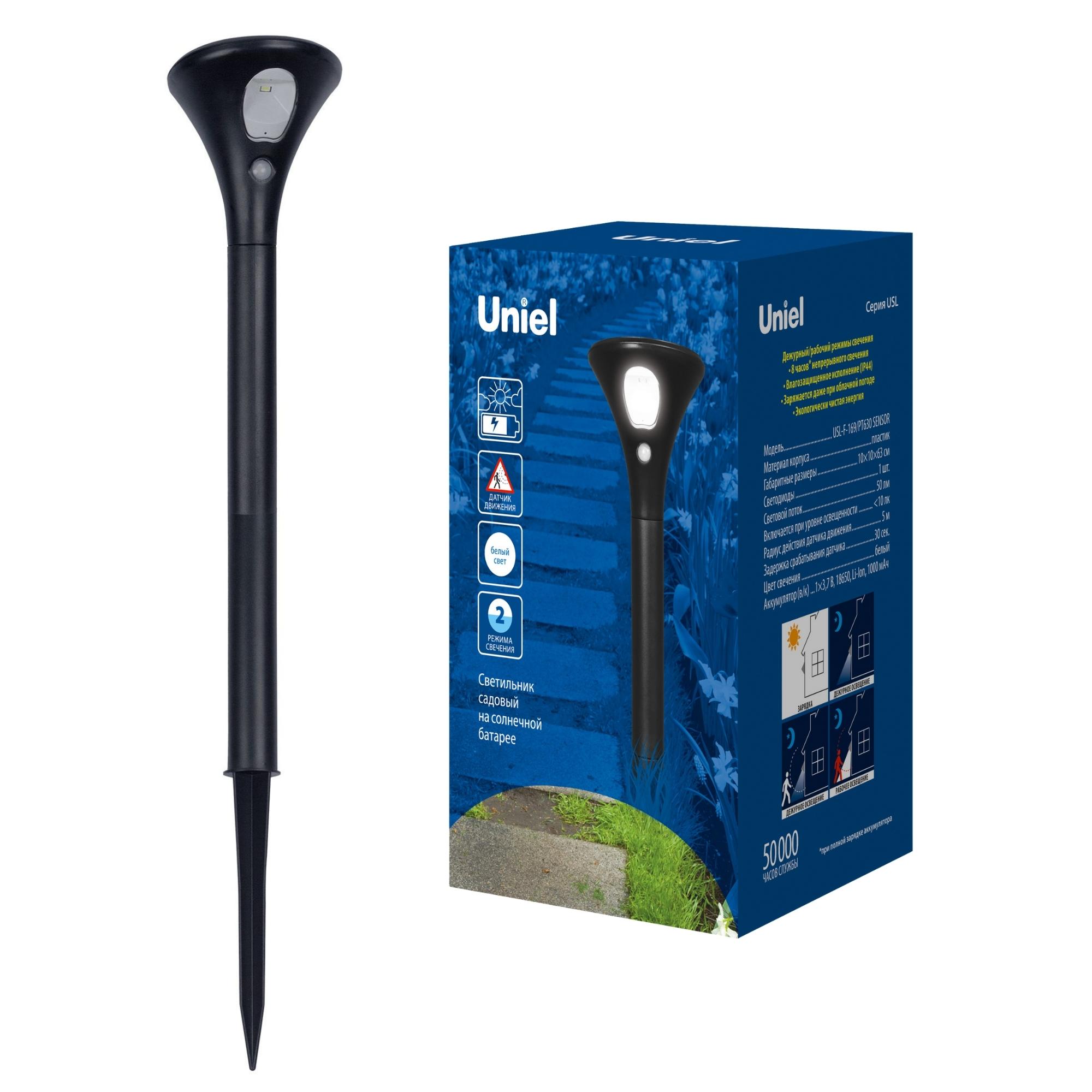 Садовый светильник на солнечной батарее USL-F-169/PT630 SENSOR с датчиком движения предназначен для уличного освещения и декоративной подсветки зданий, дорожек, высокого газона. Светильник работает в двух режимах: дежурное освещение (постоянная подсветка в темное время суток) и рабочее освещение (яркая подсветка, включается при срабатывании датчика движения). Радиус действия датчика движения — 5 м. Яркая подсветка продолжает работать еще 30 сек после окончания движения в радиусе действия датчика. В светильнике используется один светодиод, цвет свечения - белый. Корпус светильника изготовлен из черного пластика, пылевлагозащита - IP44. Подключение к электросети не требуется. Диапазон рабочих температур светильника от -20 до +40 °C. В комплект поставки входят все необходимые элементы для сборки. Установка светильника осуществляется путем вкручивания колышка в грунт. На корпусе имеется удобный выключатель непостредственно под истоником света. Светильник легко установить в любое место путем вкручивания колышка в грунт. Встроенный аккумулятор 1000 мАч, заряжается в светлое время суток с помощью солнечной панели. Полностью заряженный аккумулятор обеспечивает свечение до 8 часов. Габариты собранного устройства - ДхШхВ 100х100х630 мм. Общий вес комплекта 317 г. Гарантия 1 год. Срок службы светильника - 50 000 часов.