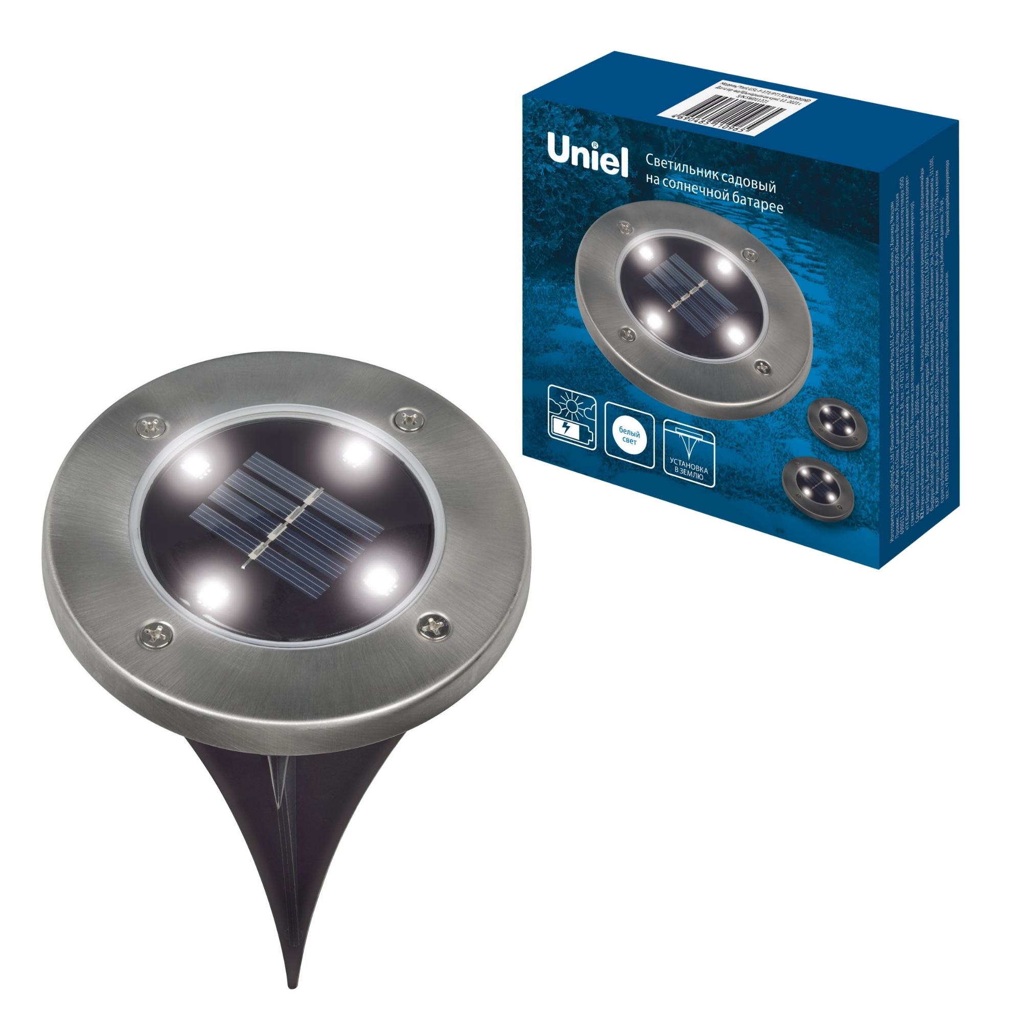 Ландшафтный садовый светильник на солнечной батарее USL-F-171/PT130 INGROUND предназначен для декоративной подсветки дорожек, ступенек. Устанавливается путем вкурчивания колышка в грунт. В светильнике используются светодиоды (SMD, 4 шт), цвет свечения - белый. Светильник предназначен для уличной подсветки, диапазон рабочих температур светильника от -20 до +35 °С. Корпус светильника изготовлен из черного пластика и нержавеющей стали, цвет — серебряный, степень защиты от влаги IP44. Удобный выключатель расположен на оборотной стороне светильника. Лаконичный и стильный дизайн устройства подойдет для подсветки любой территории. Подключение к электросети не требуется. Встроенный аккумулятор 600 мАч, заряжается в светлое время суток с помощью солнечной панели. Полностью заряженный аккумулятор обеспечивает освещение до 8 часов. Габариты собранного устройства - ДхШхВ 115х115х135 мм. Общий вес комплекта 163 г. Гарантия - полгода. Срок службы светильника - 30 000 часов.
