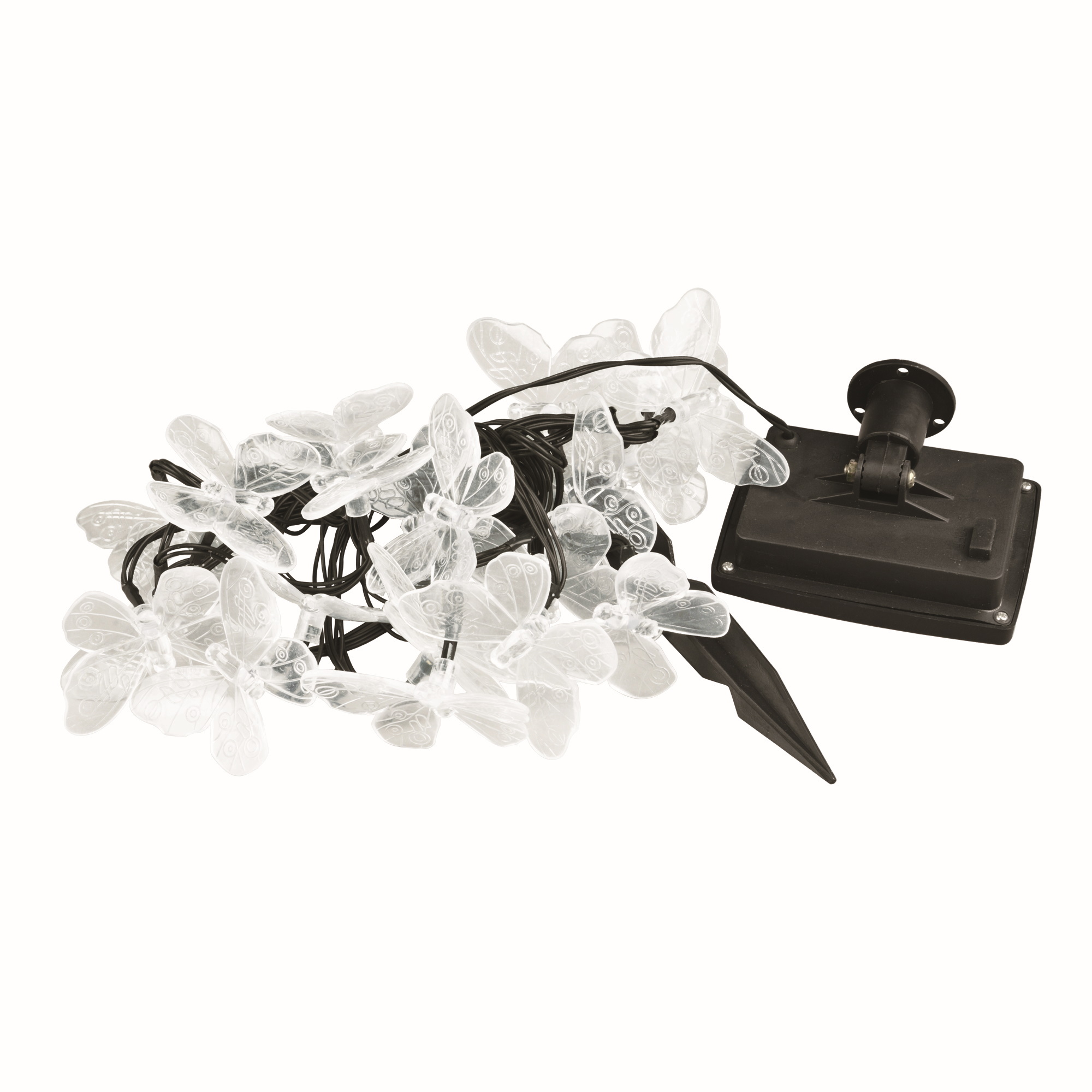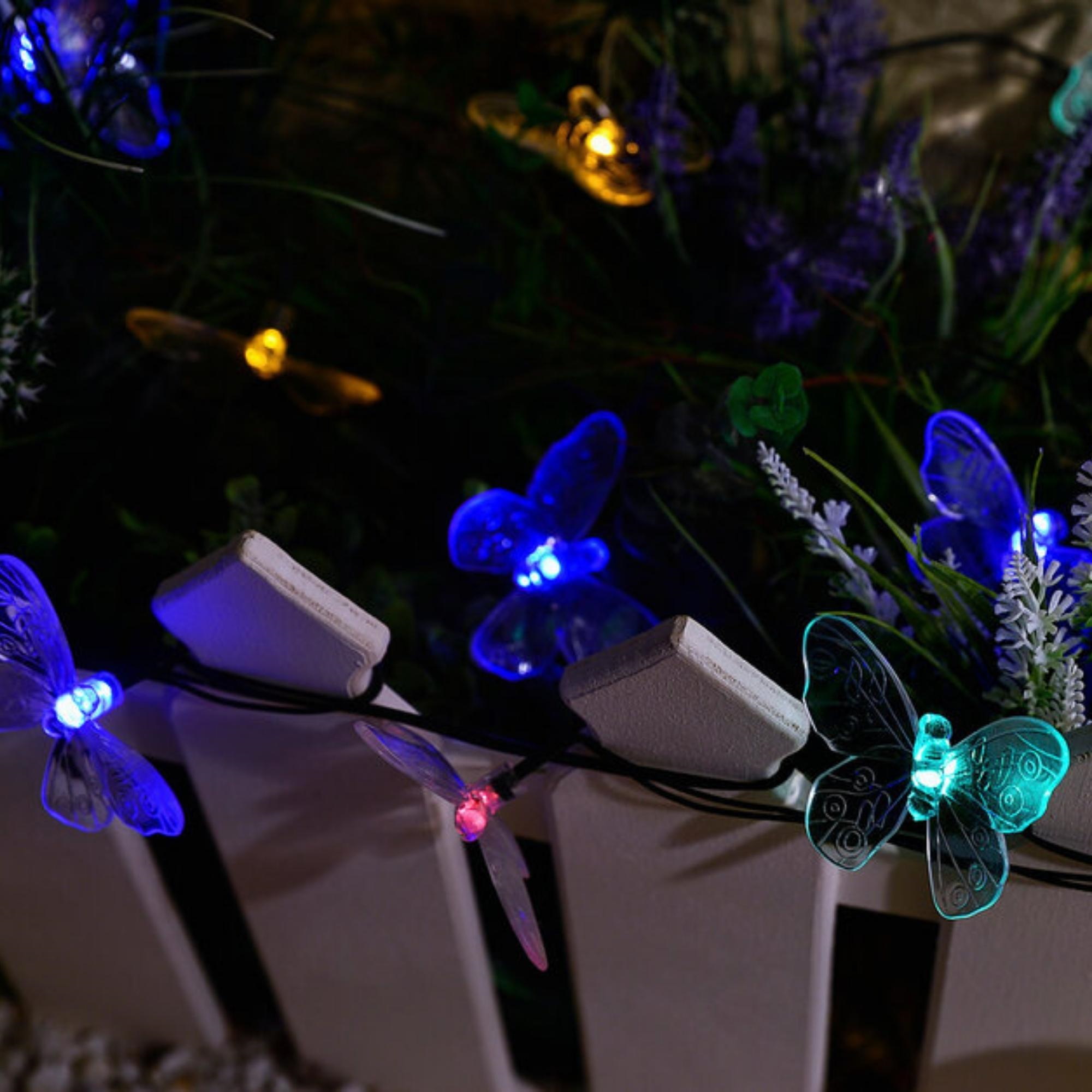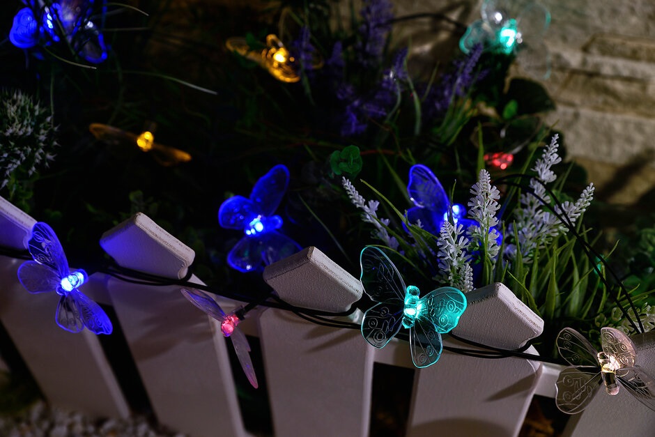 Садовая гирлянда на солнечной батарее «Бабочки» USL-S-129/PT4000 BUTTERFLIES предназначена для декоративной подсветки сада — деревьев, беседок и композиций на участке. Комплект представляет собой общий направляющий провод с присоединенными к нему светильниками в виде бабочек. Солнечная панель устанавливается в землю с помощью колышка (в комплекте). В гирлянде используются светодиоды (20 шт). Два режима свечения: постоянное и мигание, цвет свечения — разноцветный (красный, желтый, зеленый, синий). Гирлянда предназначена для уличной подсветки, диапазон рабочих температур - от -20 до +35 °С. Корпус каждого светильника изготовлен из прозрачного пластика, степень пылевлагозащиты IP44. Гирлянда дополнит ландшафтный дизайн и станет украшением на праздник. Подключение к электросети не требуется. Встроенный аккумулятор 400 мАч, заряжается в светлое время суток с помощью солнечной панели. Полностью заряженный аккумулятор обеспечивает свечение до 8 часов. Удобный выключатель расположен на батарейном блоке. Длина гирлянды 4 м, длина провода 2 м. Габариты изделия - ДхШхВ 4000х70х40 мм. Общий вес комплекта 457 г. Гарантия - полгода. Срок службы гирлянды - 30 000 часов.