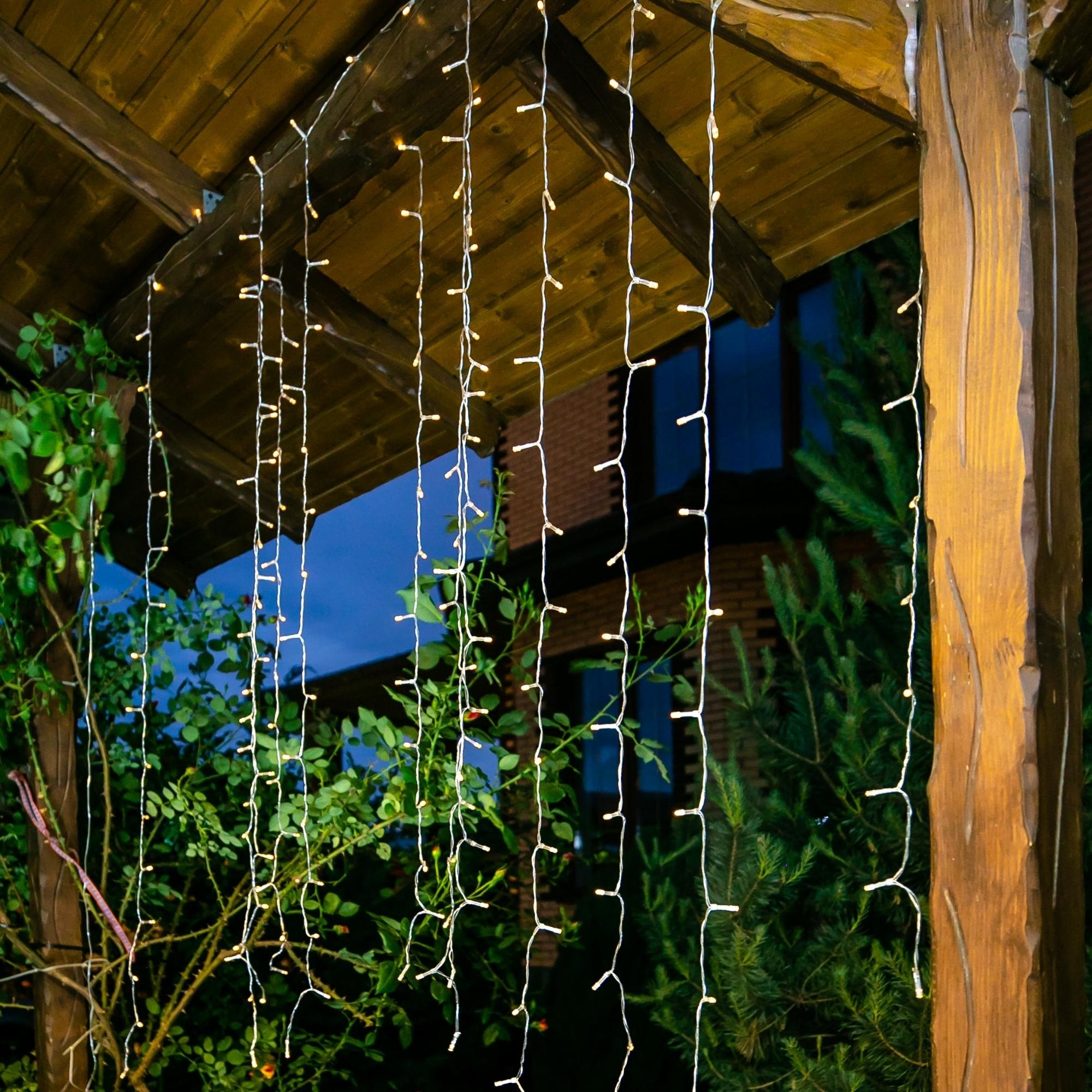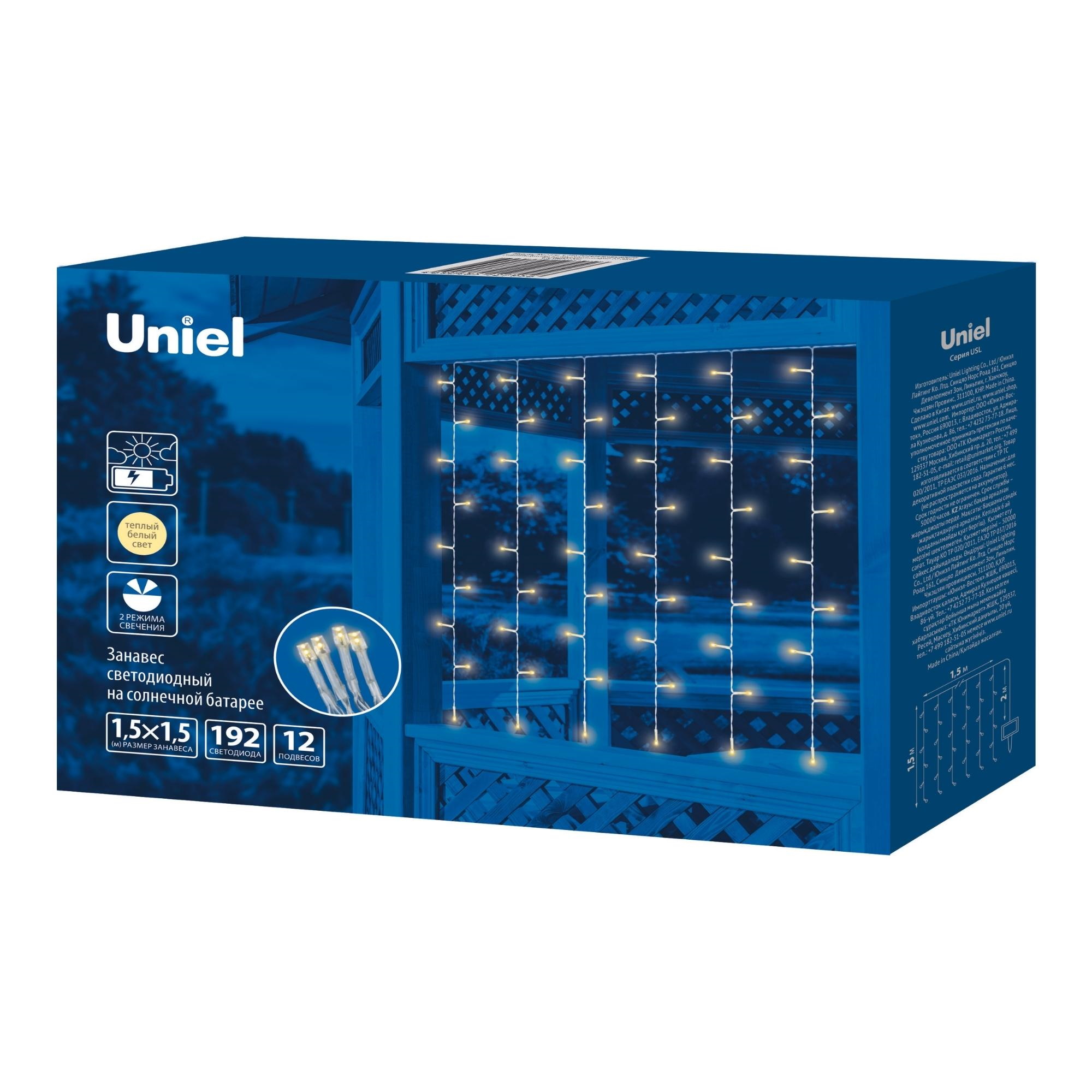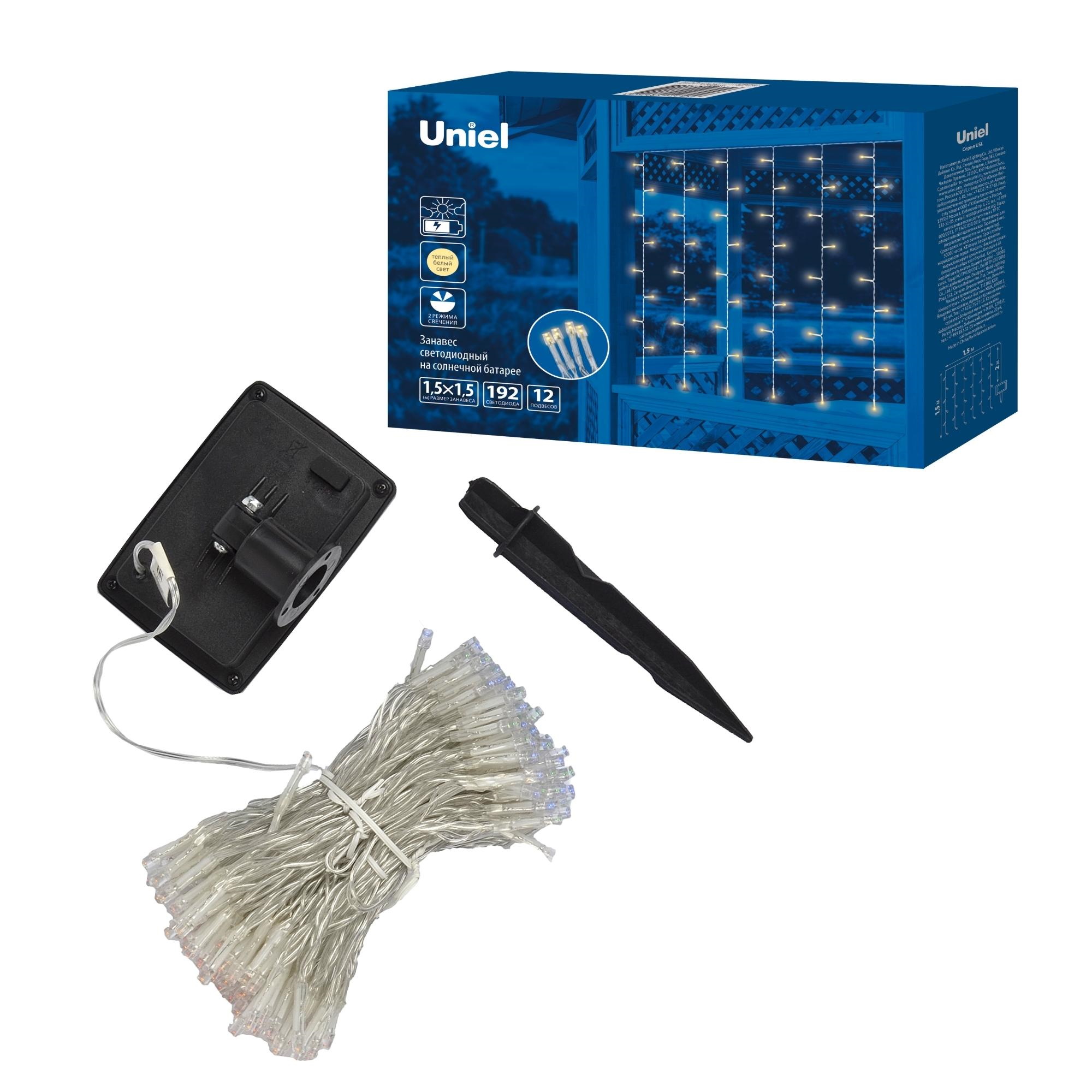 Садовый занавес на солнечной батарее USL-S-131/PT1515 WARM WHITE CURTAIN предназначен для декоративной подсветки сада — для беседки, веранды, крыльца. Комплект представляет собой общий направляющий провод с 12 подвесами, к которым присоединены светильники в форме мини-ламп. В занавесе используются светодиоды (192 шт). Солнечная панель устанавливается в землю с помощью колышка (в комплекте). Два режима свечения: постоянное и мигание, цвет свечения — теплый белый. Световой поток 350 лм. Занавес предназначен для уличной подсветки, диапазон рабочих температур - от -20 до +35 °С. Гирлянда-занавес отлично подойдет для декора и подсветки придомовой территории. Корпус каждого светильника изготовлен из прозрачного пластика, степень пылевлагозащиты IP44. Подключение к электросети не требуется. Встроенный аккумулятор 600 мАч, заряжается в светлое время суток с помощью солнечной панели. Полностью заряженный аккумулятор обеспечивает свечение до 8 часов. Удобный выключатель расположен на батарейном блоке. Длина гирлянды 1.5 м, длина провода 2 м. Габариты изделия - ДхШхВ 1500х100х1520 мм. Общий вес комплекта 383 г. Гарантия - полгода. Срок службы гирлянды - 50 000 часов.