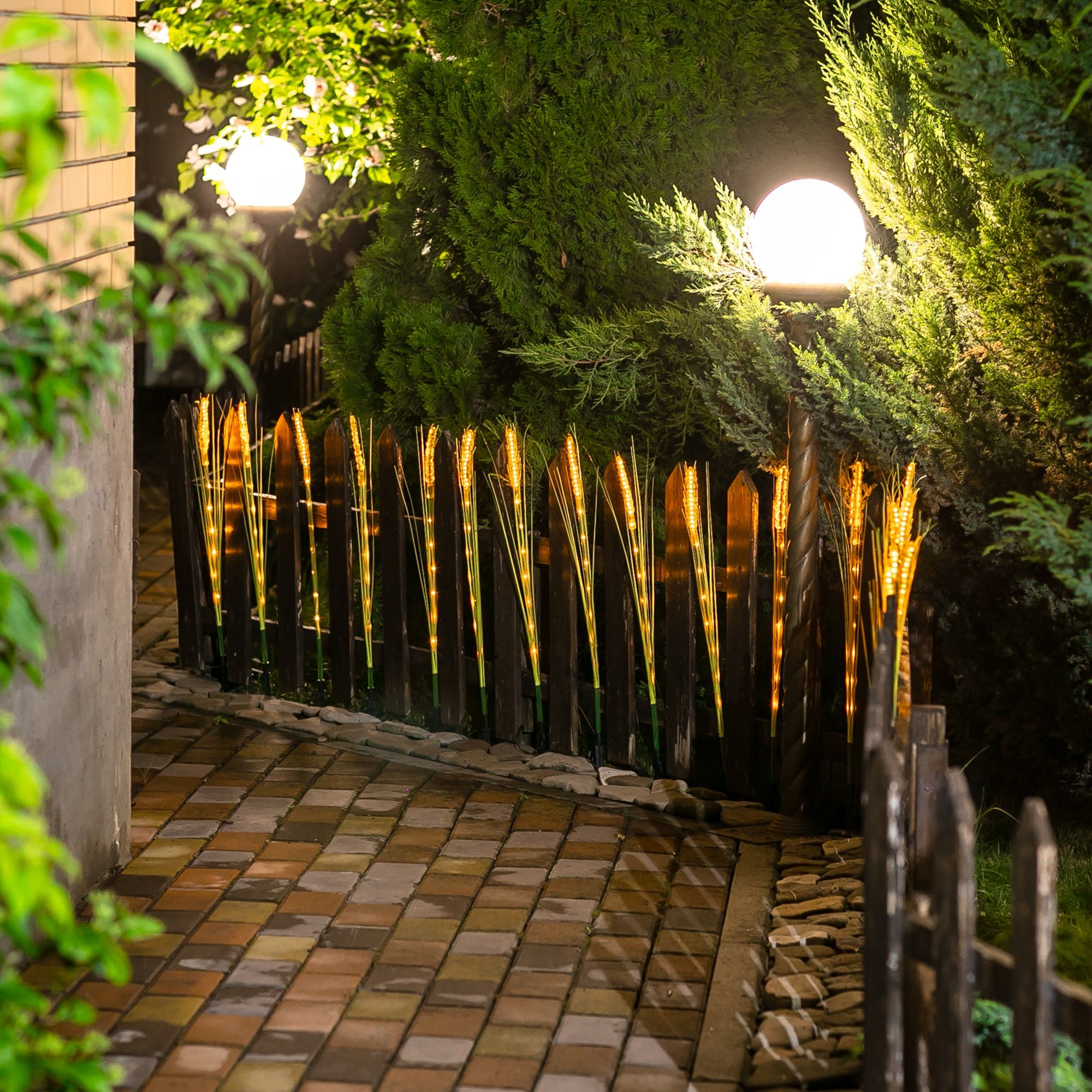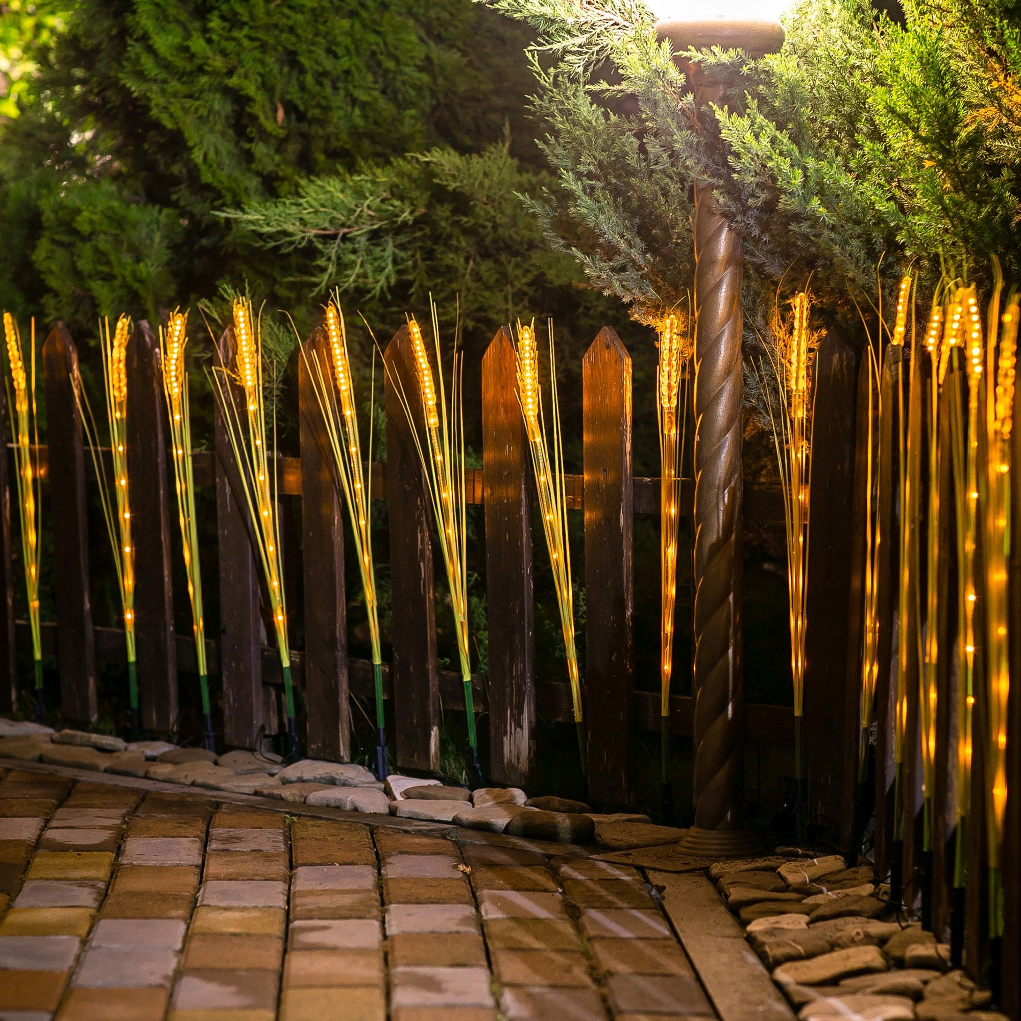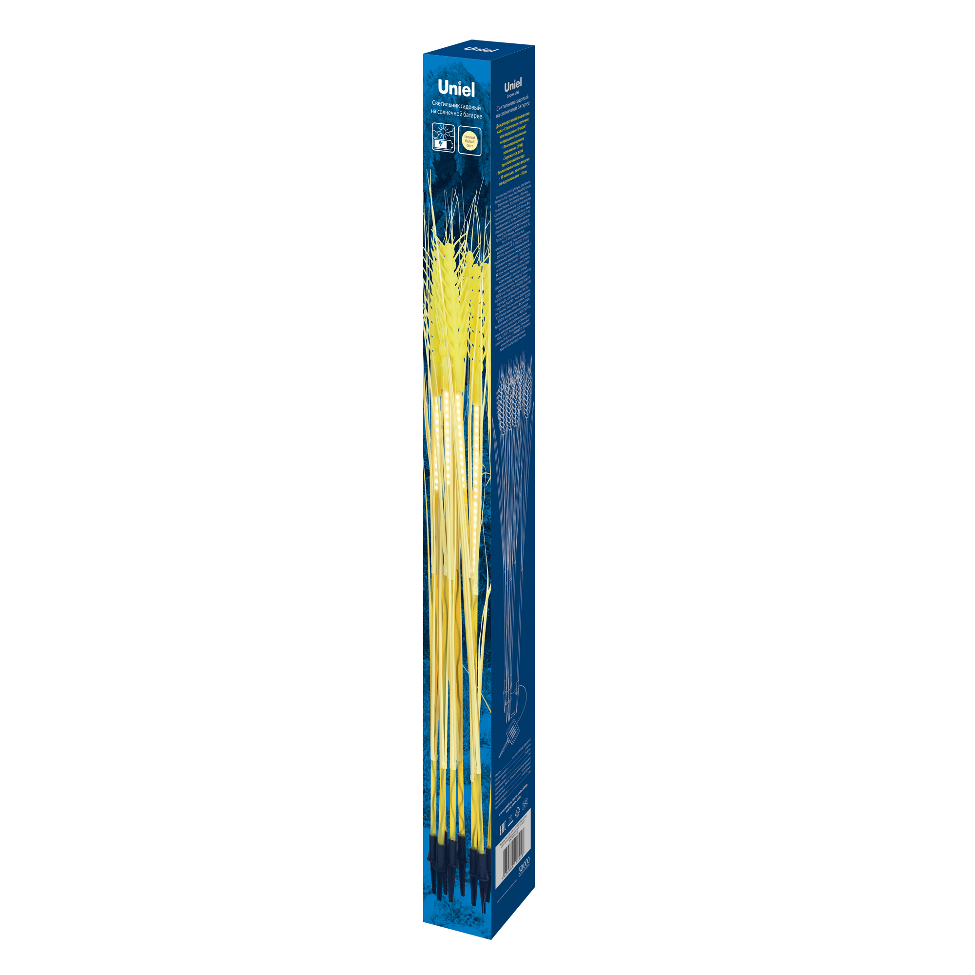 Садовый светильник на солнечной батарее «Колосья» USL-S-817/PT800 CORN SET10 предназначен для декоративной подсветки сада - для газонов, клумб. Набор состоит из 10 колосьев, соединенных общим проводом. Колосья и солнечная панель устанавливаются вертикально в землю с помощью пик. В комплекте используется 200 светодиодов, по 20 шт. в каждом колосе. Два режима свечения: постоянное и мигание, цвет свечения — теплый белый. Светильник предназначен для уличной подсветки, диапазон рабочих температур светильника от -20 до +40 °С. Корпус светильника изготовлен из желтого пластика, степень пылевлагозащиты IP44. Удобный выключатель расположен на корпусе батарейного блока. Подключение к электросети не требуется. Встроенный аккумулятор 600 мАч, заряжается в светлое время суток с помощью солнечной панели. Полностью заряженный аккумулятор обеспечивает свечение до 8 часов. Длина провода 0,42 м. Габариты собранного устройства - ДхШхВ 3600х100х750 мм. Общий вес комплекта 624 г. Гарантия - полгода. Срок службы светильника - 50 000 часов.