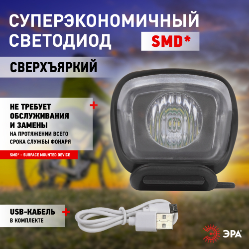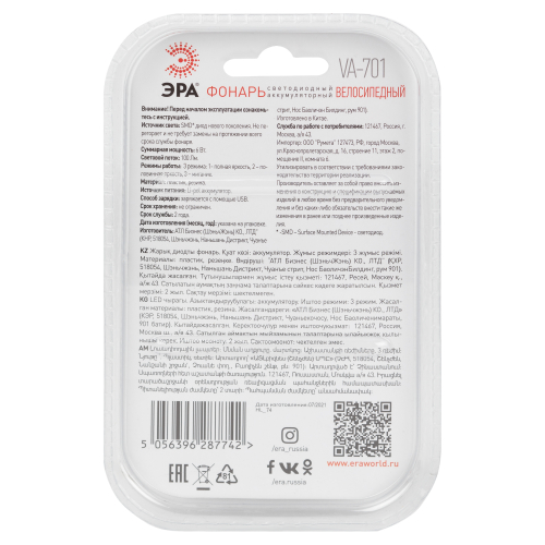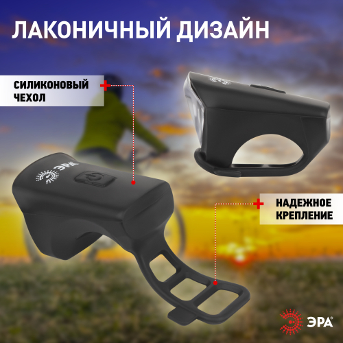 ЭРА VA-701 - эргономичный велосипедный LED-фонарь в силиконовом чехле. Удобно крепится на руль или раму без дополнительных аксессуаров. Работает от встроенного литиевого аккумулятора, подзаряжается от USB (microUSB-кабель в комплекте!). Обеспечит ваши велопоездки качественным ярким светом в трех режимах - 100% яркости, 50% яркости, мигание. Световой поток - 100 Лм. В этом современном велофонаре от торговой марки ЭРА установлены светодиоды нового поколения - не тускнеют и не перегорают в течение всего срока службы. Мощность велофонарика - 6 Вт. От одной полной подзарядки без перерывов светит 4 часа.