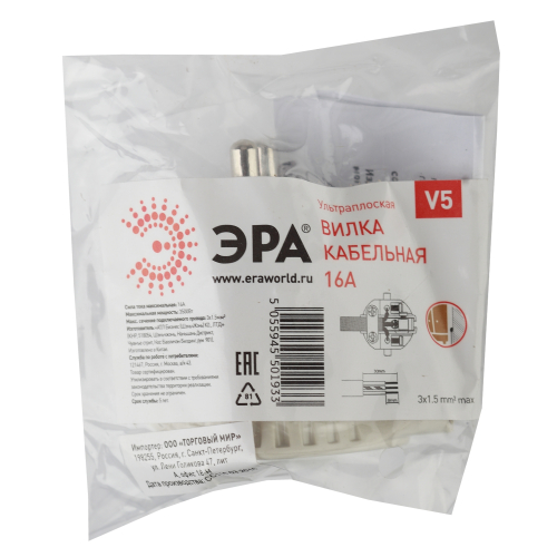 Вилка штепсельная ЭРА, с заземлением, максимальная мощность - 16 A/3500 В (кабель до 3x1.5мм2), поликарбонат