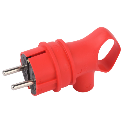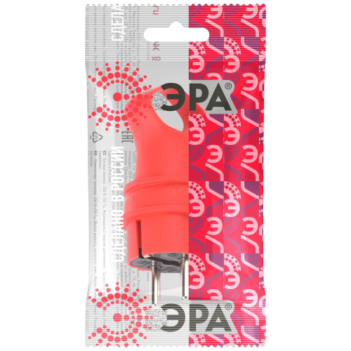 Угловая красная каучуковая вилка с кольцом из серии каучуковых разъёмов ЭРА российского производства. Имеется аналог в чёрном цвете. Рассчитана на нагрузку до 16 А и позволяет подключать кабель КГ сечением до 3x2.5 мм². Вилка с заземлением.