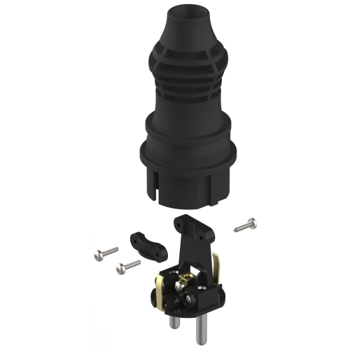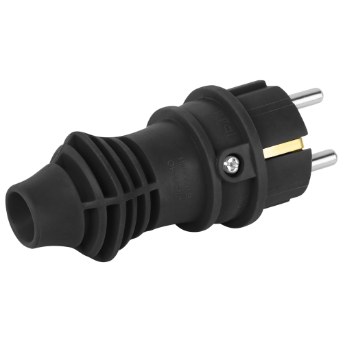 Прямая чёрная каучуковая вилка с заземлением из серии каучуковых разъёмов ЭРА российского производства. Имеется аналог в красном цвете. Рассчитана на нагрузку до 16 А и позволяет подключать кабель КГ сечением до 3x2.5 мм².