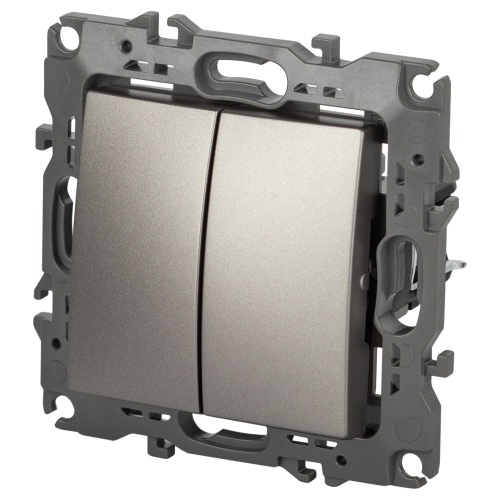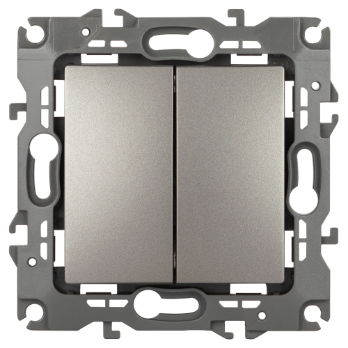 Выключатель двухклавишный серии Эра 12 скрытой установки механизм цвет титан 12-1104-16. Номинальные характеристики 10А 250В . Сделан из поликарбоната, оснащён автоматическими клеммами для быстрой и надёжной фиксации жил кабеля в механизме. Парные клеммы обеспечивают соединение шлейфом. Монтаж в подрозетник производится и на лапки, и на винты. Рамки приобретаются отдельно.