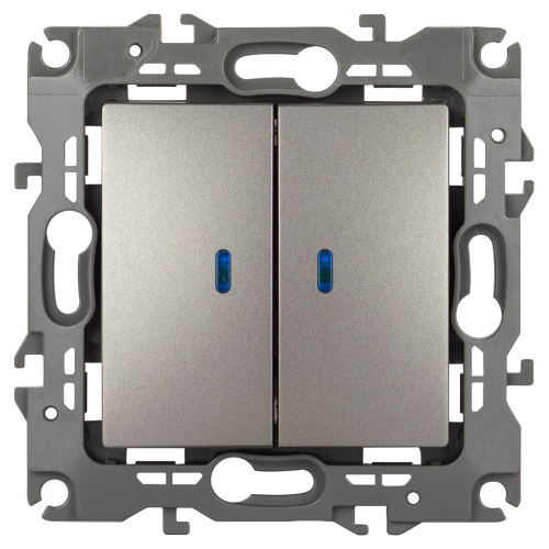 Выключатель двухклавишный с подсветкой серии Эра 12 скрытой установки механизм цвет титан 12-1105-16. Номинальные характеристики 10А 250В . Сделан из поликарбоната, оснащён автоматическими клеммами для быстрой и надёжной фиксации жил кабеля в механизме. Парные клеммы обеспечивают соединение шлейфом. Монтаж в подрозетник производится и на лапки, и на винты. Рамки приобретаются отдельно.