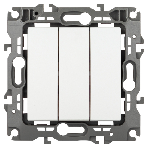 Выключатель трехклавишный серии Эра 12 скрытой установки механизм цвет белый матовый 12-1107-01М. Номинальные характеристики 10А 250В . Сделан из поликарбоната, оснащён винтовыми уникальными клеммами ЭКСПЕРТ для надёжной фиксации жил кабеля в механизме. Парные клеммы обеспечивают соединение шлейфом. Монтаж в подрозетник производится и на лапки, и на винты. Рамки приобретаются отдельно.