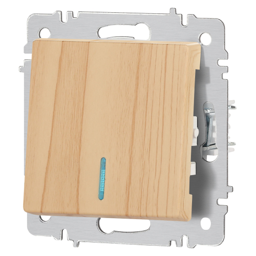 Выключатель 1-клавишный с подсветкой серии Intro Accent скрытой установки механизм цвет сосна 6-102-11. Номинальные характеристики 10А 250В. Выполнен из негорючего термопласта, оснащён винтовыми клеммами. Парные клеммы обеспечивают соединение шлейфом. Монтаж в подрозетник производится и на лапки, и на винты. Рамка приобретается отдельно. В серии представлены рамки до 5 постов: на 1 пост - 6-501-хх, на 2 поста - 6-502-хх, на 3 поста - 6-503-хх, на 6 поста - 4-504-хх, на 5 постов - 6-505-хх (где хх - цветовой код: 01 - белый, 01М - матовый белый, 02 - слоновая кость, 03 - алюминий, 04 - шампань, 05 - антрацит, 06 - перламутр, 07 - графит, 08 - бронза, 09 - титан, 10 - венге, 11 - сосна).