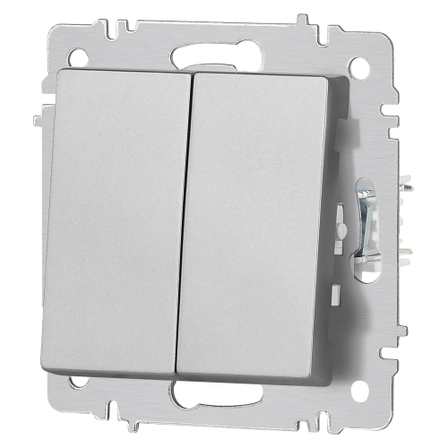 Выключатель 2-клавишный серии Intro Accent скрытой установки механизм цвет алюминий 6-104-03. Номинальные характеристики 10А 250В. Выполнен из негорючего термопласта, оснащён винтовыми клеммами. Парные клеммы обеспечивают соединение шлейфом. Монтаж в подрозетник производится и на лапки, и на винты. Рамка приобретается отдельно. В серии представлены рамки до 5 постов: на 1 пост - 6-501-хх, на 2 поста - 6-502-хх, на 3 поста - 6-503-хх, на 6 поста - 4-504-хх, на 5 постов - 6-505-хх (где хх - цветовой код: 01 - белый, 01М - матовый белый, 02 - слоновая кость, 03 - алюминий, 04 - шампань, 05 - антрацит, 06 - перламутр, 07 - графит, 08 - бронза, 09 - титан, 10 - венге, 11 - сосна).