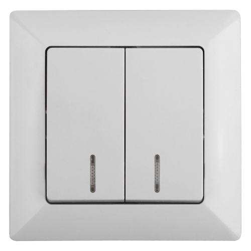 Выключатель 2-клавишный с подсветкой серии Intro Solo скрытой установки цвет белый 4-105-01. Номинальные характеристики 10А 250В. Цвет подсветки - красный. Выключатель выполнен из качественного негорючего термопласта, укомплектован одноместной рамкой, оснащён винтовыми клеммами. Вертикальное расположение клемм обеспечивает удобный и надёжный монтаж. Клеммы с двумя отверстиями позволяют соединять соседние выключатели шлейфом. Установка в подрозетник производится как на монтажные лапки, так и на винты. Для установки 2-х и более выключателей в несколько подрозетников в ряд дополнительно используются многоместные рамки: 2-х постовая - 4-502-хх, 3-х постовая 4-503-хх, 4-х постовая - 4-504-хх (где хх - цветовой код: 01 - белый, 02 - слоновая кость, 03 - алюминий, 04 - шампань, 05 - антрацит, 10 - венге, 11 - сосна).