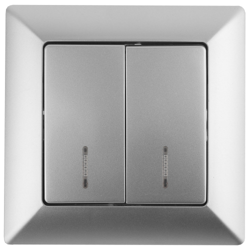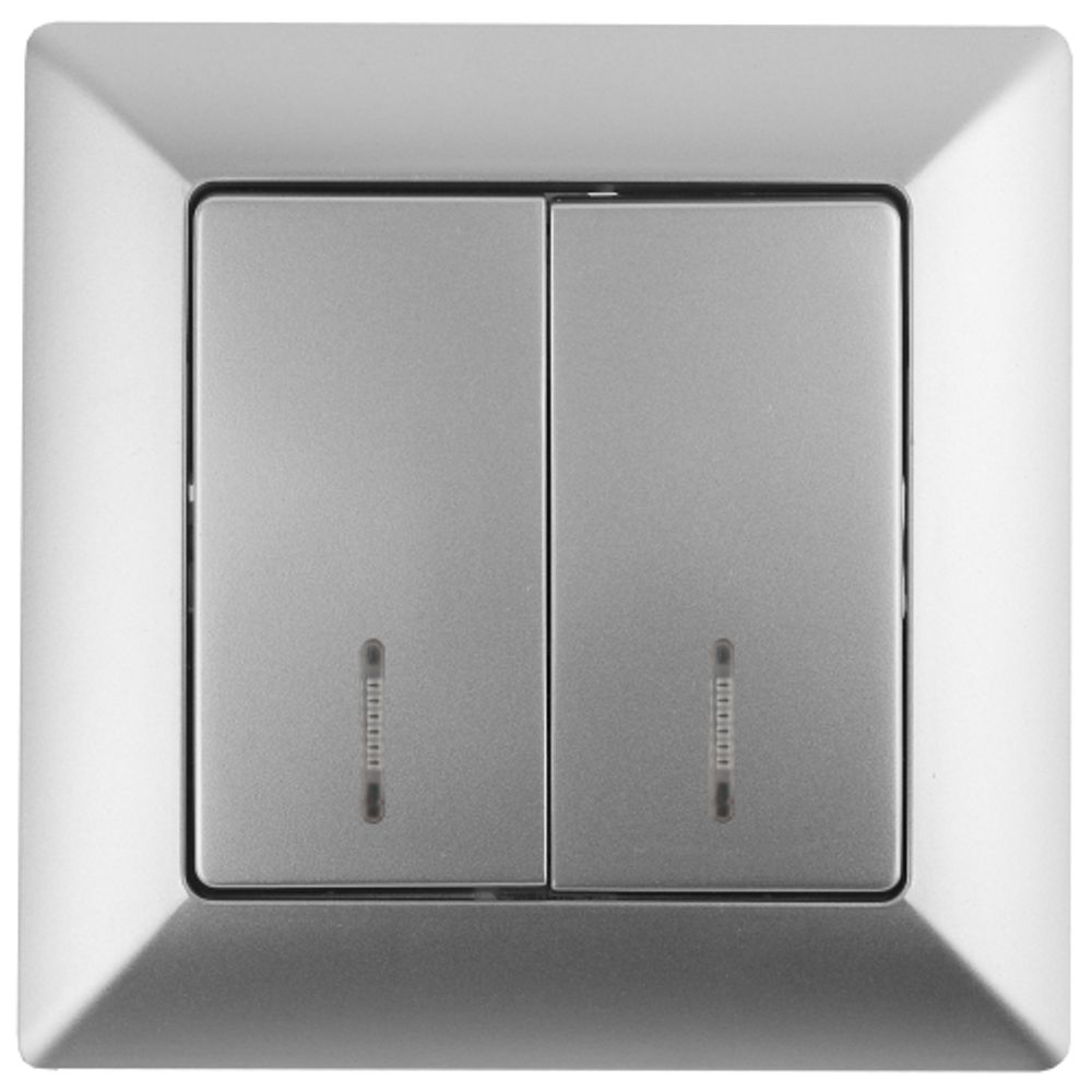Выключатель 2-клавишный с подсветкой серии Intro Solo скрытой установки цвет алюминий 4-105-03. Номинальные характеристики 10А 250В . Выключатель выполнен из качественного негорючего термопласта, укомплектован одноместной рамкой, оснащён винтовыми клеммами. Вертикальное расположение клемм обеспечивает удобный и надёжный монтаж. Клеммы с двумя отверстиями позволяют соединять соседние выключатели шлейфом. Установка в подрозетник производится как на монтажные лапки, так и на винты. Для установки 2-х и более выключателей в несколько подрозетников в ряд дополнительно используются многоместные рамки: 2-х постовая - 4-502-хх, 3-х постовая 4-503-хх, 4-х постовая - 4-504-хх (где хх - цветовой код: 01 - белый, 02 - слоновая кость, 03 - алюминий, 04 - шампань, 05 - антрацит, 10 - венге, 11 - сосна).