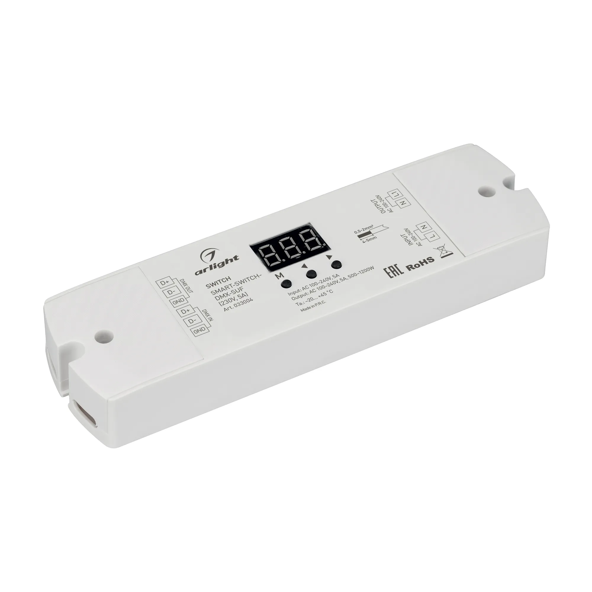 Релейный модуль (выключатель) для любых видов источников света с напряжением питания 230В, в том числе и гибкого неона. Релейный модуль осуществляет включение и выключение источников света и управляется цифровым сигналом DMX512. Устройство совместимо с панелями управления с выходом DMX512 и контроллерами DMX512. Также, управление релейным модулем осуществляется кнопками на корпусе, а информация о режиме отображается на цифровом дисплее. Питание устройства составляет 230В, максимальный ток 5А на 1 канал, максимальная мощность 1150Вт, 1 канал управления. Габариты декодера составляют 170х50х23мм, корпус белого цвета.