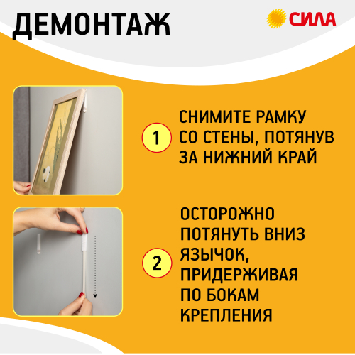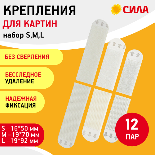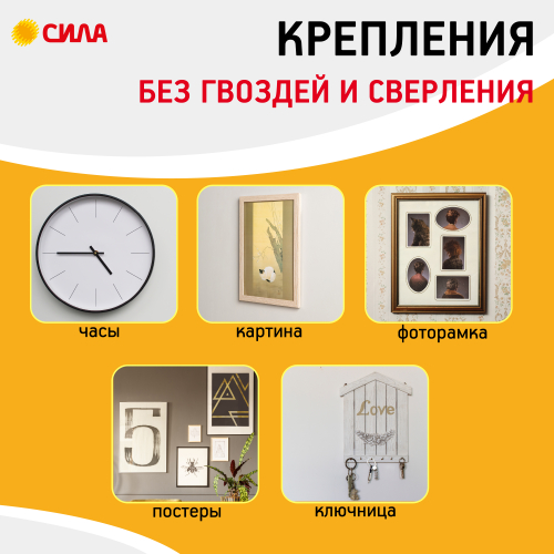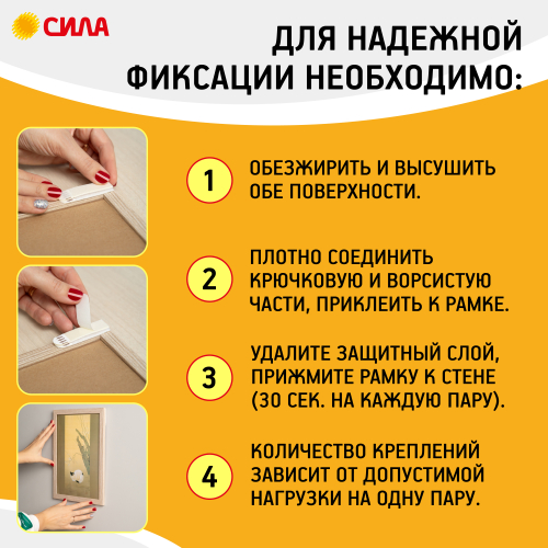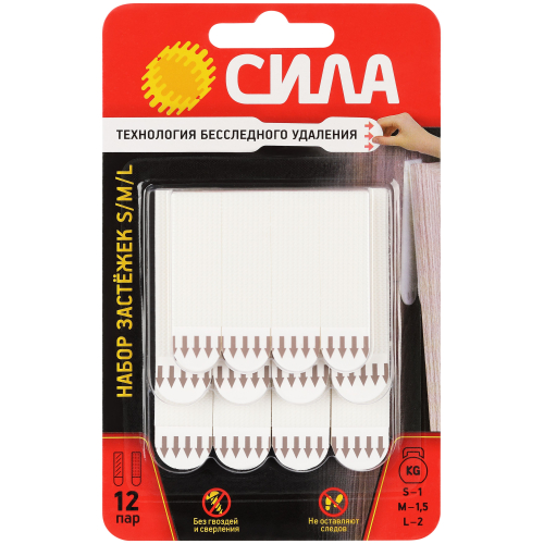 Застежки СИЛА с технологией бесследного удаления созданы специально для рамок, картин, плакатов, настенных часов, домофонов, роутеров и других предметов. Они легко удаляются, не повреждая стен. Все предметы зафиксированные настенными застежкам, легко и без следа заменяются. Одна застежка фиксируется на стене, а другая - на раме. Максимальная нагрузка: S - 1 кг на 1 пару или 4 кг на упаковку, М - 1,5 кг на 1 пару или 6 кг на упаковку, L - 2 кг на 1 пару или 8 кг на упаковку/