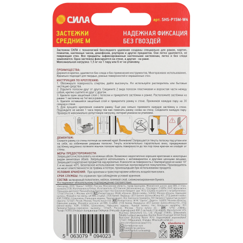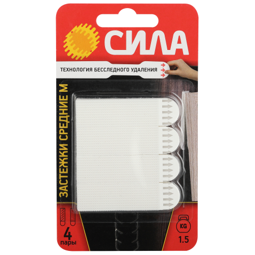 Застежки СИЛА с технологией бесследного удаления созданы специально для рамок, картин, плакатов, настенных часов, домофонов, роутеров и других предметов. Они легко удаляются, не повреждая стен. Все предметы зафиксированные настенными застежкам, легко и без следа заменяются. Одна застежка фиксируется на стене, а другая - на раме. Максимальная нагрузка: 1,5 кг на 1 пару или 6 кг на упаковку