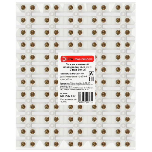 Зажимы винтовые изолированные ЗВИ-нг ЭРА представляют из себя контактную латунную колодку с зажимным винтом, заключенную в диэлектрический негорючий корпус и предназначены для создания проходного соединения всех типов проводников, защищая провод от повреждения и исключая возможность замыкания на корпус электроустановки. Применяются в распаячных коробках, для подключения осветительного и другого электрооборудования.