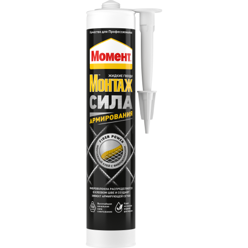 Момент Монтаж Сила Армирования - Универсальный монтажный клей на основе водной дисперсии полиакрилатов с добавкой армирующих волокон. Основные преимущества: • Новая технология "армирующих волокон" - нити синтетического волокна распределяются внутри шва, формируя армирующую сетку • Экстра высокая начальная сила схватывания: до 150 кг/м2. Самая высокая среди монтажных клеев на водной основе • Конечная сила схватывания до 6 Н/мм2 • Экологичность: отсутствие в составе органических растворителей и иных опасных компонентов