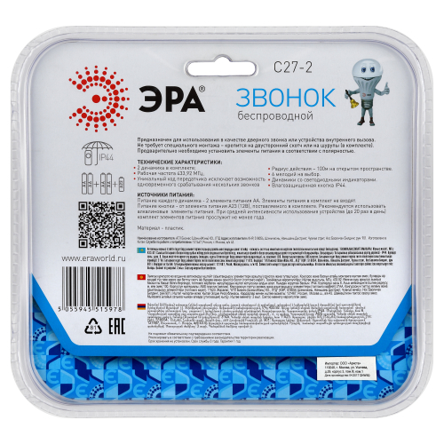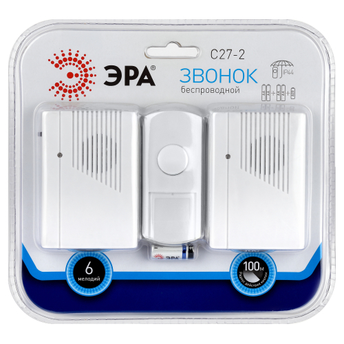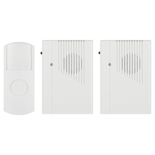 Беспроводной электрический дверной звонок с 2 динамиками в комплекте. Динамики можно с удобством разместить в разных комнатах или разных помещениях (актуально для дач и загородных домов с многочисленными постройками на территории). Радиус действия до 100 метров. Кнопка защищена от влаги и пыли (IP44). В числе преимуществ 6 встроенных мелодий и световой сигнал. Звонок работает от батареек: для кнопки - 1 шт А23 (входит в комплект), для каждого из динамиков - по 2 шт АА пальчиковые (в комплект не входят).