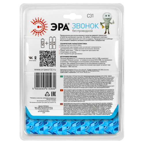 Беспроводной цифровой дверной звонок с 32 полифоническими мелодиями и световым сигналом. Радиус действия - до 100 метров. Работает от батареек: 1 шт А23 для кнопки (входит в комплект), 2 шт АА пальчиковые для динамика (в комплект не входят). Кнопка и динамик имеют степень защиты IP20 (не подходит для использования на улице). Аккуратный лаконичный дизайн, базовый белый цвет актуален для любого интерьера. Над кнопкой предусмотрено пространство для указания номера квартиры. Звук звонка не надоест со временем, так как мелодии легко менять по настроению.
