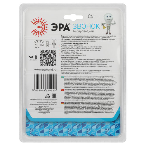 Беспроводной электрический дверной звонок с 32 мелодиями и влагозащищённой кнопкой, под которой предусмотрено пространство для указания номера квартиры. Прост в подключении. Отсутствие проводов позволяет использовать звонок с максимальным удобством. Динамик можно разместить в коридоре или взять с собой в комнату/на кухню если не хотите разбудить кого-то из домочадцев. Беспроводные звонки ЭРА хороши для дачи или загородного дома установите кнопку на дверной калитке, а динамик в помещении. Радиус действия - до 100 метров. Звонок работает от батареек: 1 шт А23 для кнопки (входит в комплект), 2 шт АА пальчиковые для динамика (в комплект не входят). При среднем использовании (до 20 звонков в день) исправно проработает без замены элементов питания не менее года.