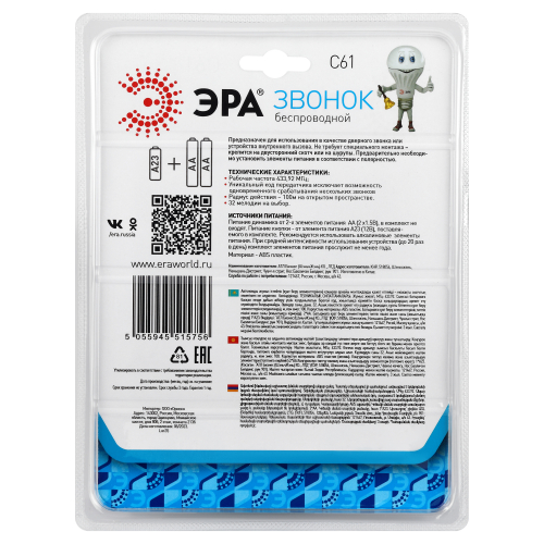 Беспроводной электрический дверной звонок с 32 мелодиями и влагозащищённой кнопкой, над которой предусмотрено пространство для указания номера квартиры. Прост в подключении. Отсутствие проводов позволяет использовать звонок с максимальным удобством. Динамик можно разместить в коридоре или взять с собой в комнату/на кухню если не хотите разбудить домочадцев. Беспроводные звонки ЭРА хороши для дачи или загородного дома установите кнопку на дверной калитке, а динамик в помещении. Радиус действия - до 100 метров. Звонок работает от батареек: 1 шт А23 для кнопки (входит в комплект), 2 шт АА пальчиковые для динамика (в комплект не входят). При среднем использовании (до 20 звонков в день) исправно проработает без замены элементов питания не менее года.