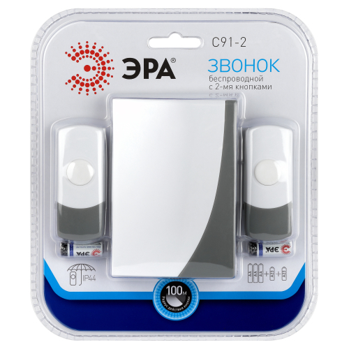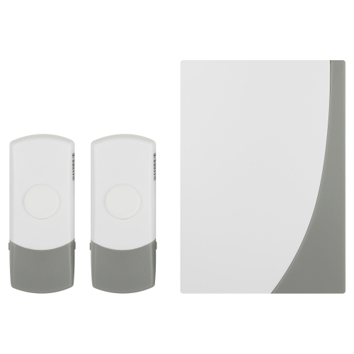 Беспроводной электрический дверной звонок с двумя кнопками, защищёнными от влаги и пыли. Отличное решение для дачи или загородного дома, когда на территорию есть разные входы. Для каждой кнопки своя полифоническая мелодия. Звонок работает от батареек: 1 шт А23 для кнопки (входит в комплект), 2 шт АА пальчиковые для динамика (в комплект не входят). Аккуратный бело-серый дизайн актуален для любого интерьера. Приятная упаковка делает данный звонок хорошим подарком на новоселье и другие праздники.