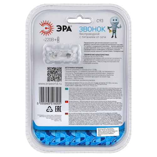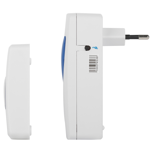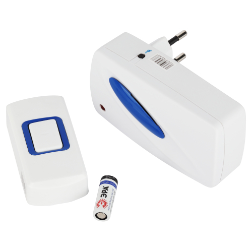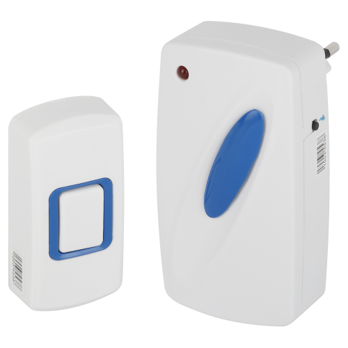 Беспроводной дверной звонок, работающий от сети. Встроенная вилка упрощает использование, позволяя за секунду подключать устройство в любом месте, где есть розетка. И переносить динамик из комнаты в комнату. Кнопка работает от батарейки А23, которая поставляется в комплекте. На выбор 6 качественных мелодий, их можно менять по настроению. Радиус действия звонка 100 метров. Компактный размер, приятная бело-синяя цветовая гамма. Аккуратная блистерная упаковка делает этот звонок отличным вариантом подарка на новоселье и другие праздники!