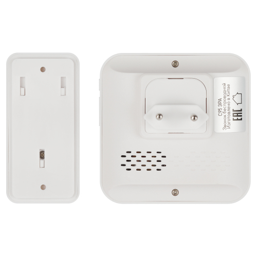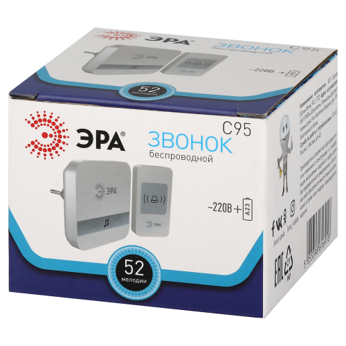 ЭРА С95 – беспроводной дверной звонок со встроенной вилкой для простого и быстрого подключения к электросети. Современный квадратный дизайн, компактный плоский корпус, базовый белый цвет. Чтобы установить звонок, нужно просто воткнуть вилку в розетку. На выбор предусмотрено 52 полифонические мелодии. Минималистичный дизайн отлично смотрится. Кнопка звонка работает от батарейки А23 (в комплекте) и легко крепится на саморезы или самоклеящуюся основу. Крепежи вы найдете в коробке. Монтаж нового дверного звонка займет у вас пару минут! Белый звонок дверной ЭРА С95 - арт. Б0054088, чёрный звонок дверной ЭРА С94 - арт. Б0054085.
